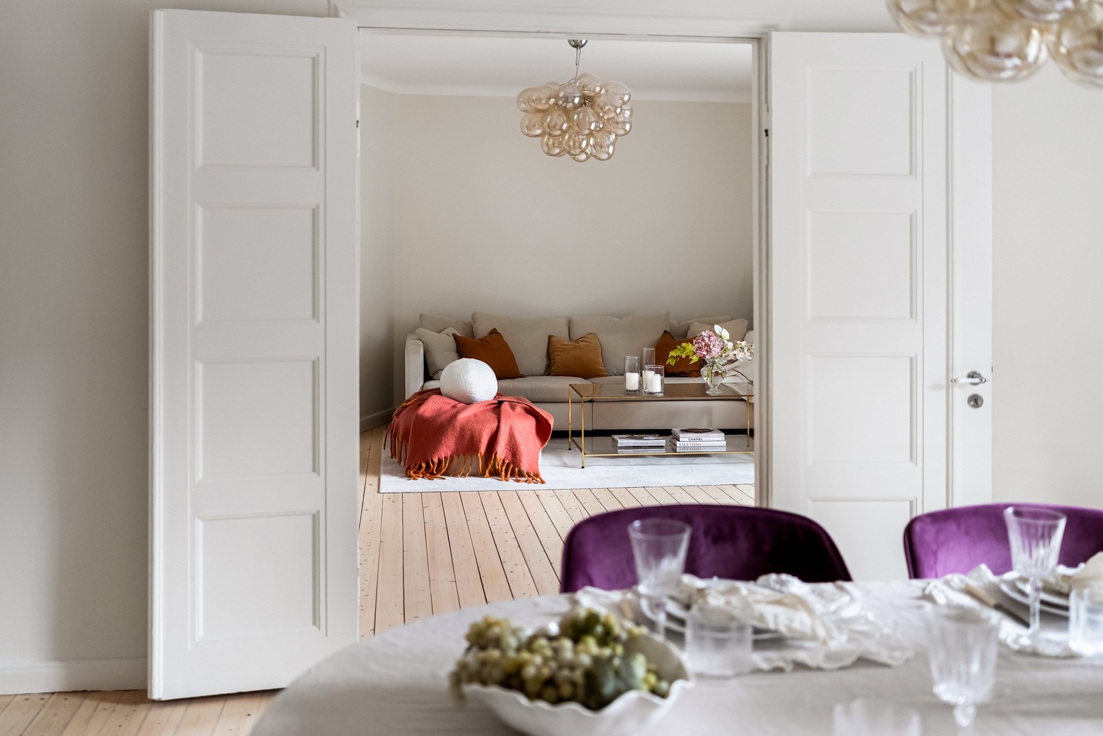 Ni välkomnas in i hallen och slås genast av den underbara hemtrevnad som bostaden utstrålar. Väggarna är målade i ljusa toner och på golvet ligger vackert brädgolv som löper genom hela bostaden. Det finns gott om plats för avhängning och möblering.