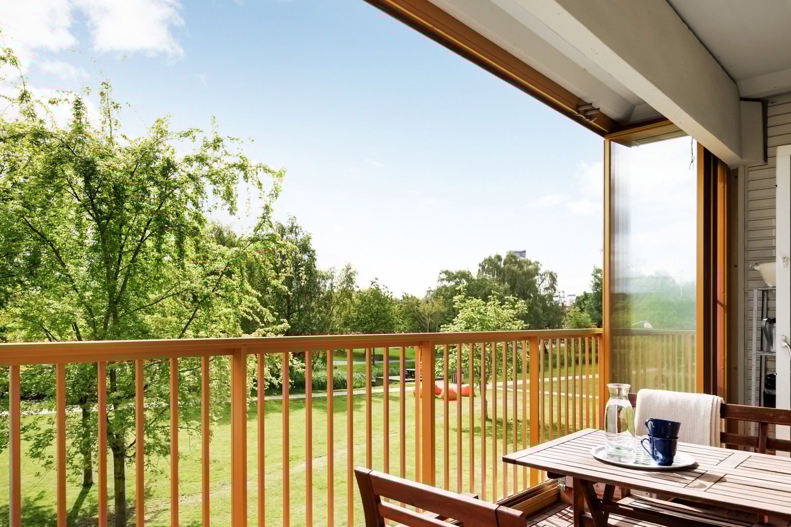 Välplanerad gaveltrea med dubbla balkonger i insynsskyddat läge med utsikt över trädkronorna!