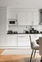 Köket är modernt i ljust och tidlöst utförande med vita spegel luckor som kompletteras av vitt kakel ovan en grå laminatbänkskiva. Detaljer i rostfritt fulländar stilen. Maskinell utrustning består av diskmaskin, inbyggd micro, ugn, häll, fläkt samt kombinerad kyl och frys. Du får med fördel plats med ett matbord intill fönstret. Köket förlängs av utgången till uteplatsen så du enkelt kan flytta ut och avnjuta middagen utomhus. Här har gigantisk yta och en rofylld oas som pekar in mot den lugna innergården samt du är avskärmad med buskage som ger en mysig känsla.
