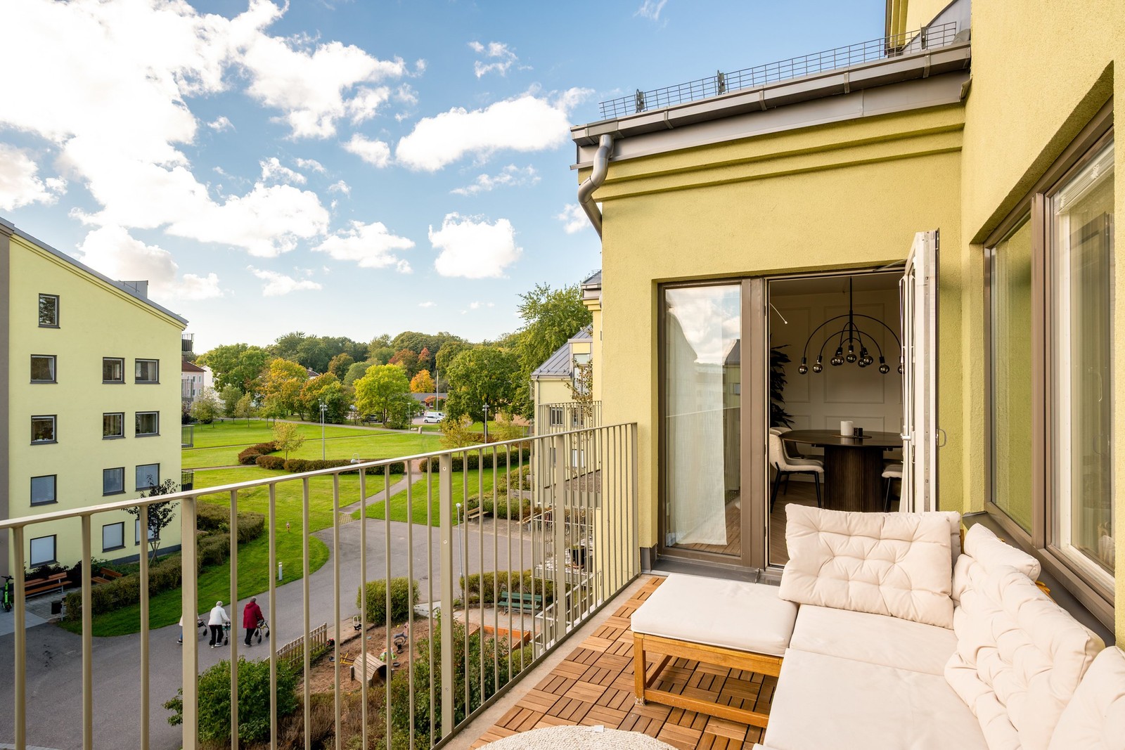 Charmig hörnlägenhet högst upp i huset med en stor balkong och som erbjuder en fantastisk utsikt över naturen. Social planlösning som även erbjuder gott om förvaring. Charmiga snedtak och en härlig takhöjd, ger lägenheten karaktär och extra golvyta. Samtliga fönsterbänkar är i granit och ger ett stilfullt intryck. Vardagsrummet ligger med öppen planlösning mot köket och utgång till balkongen ger en härlig rymd och fint ljusflöde. Nyrenoverat kök med gott om förvaring bakom köksluckorna. Stort badrum med både tvättmaskin och torktumlare i lägenheten. Ta hissen rakt ner till källarförrådet som tillhör lägenheten.