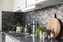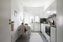 Köket är i stilrent utförande med gråa släta luckor som bryts av en med bänkskiva i laminat och rostfritt stål tillsammans med mörk sten ovan arbetsytorna. Maskinell utrustning bestående av ugn med spis, fläkt, diskmaskin samt kombinerad kyl och frys. Här ryms ett mindre matbord.