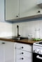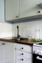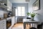 Direkt till höger ligger köket med vita skåpluckor och vitt kakel ovan bänkskiva i trä. Den maskinella utrustningen består av spis med ugn och släkt samt kombinerad kyl och frys. Ett funktionellt kök med plats för ett mindre matbord.