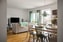 Till höger ligger det stilrena och fullutrustade köket med vita skåpluckor och vitt kakel ovan melerad bänkskiva i ljusgrått. gott om förvaring och arbetsyta. Den maskinella utrustningen består av diskmaskin, fullstor kyl och frys, spishäll, fläkt samt ugn och mikrovågsugn i arbetshöjd.