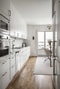 Köket är i stilrent utförande med modern köksinredning där vita släta luckor, ljus laminatbänkskiva och vitt kakel sätter sin prägel. Maskinell utrustning består av diskmaskin, fläkt, spishäll, inbyggd ugn och micro i arbetshöjd samt fullstor kyl och frys. Här ryms större matgrupp för både familj och vänner intill fönstret.