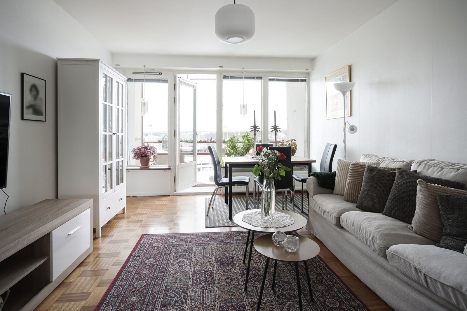Ett stort och rymligt vardagsrum ger gott om yta för både matsalsbord så som soffgrupp med tillhörande möblemang. Möblera efter eget tycke och smak. Stora fönsterpartier släpper in ett härligt ljusinsläpp. Från vardagsrummet når du balkongen som vetter mot ett soligt västerläge. Balkongen kan enkelt möbleras upp och här kan du sitta och njuta av eftermiddagssolen. Här bor du med en fin utsikt högst upp i huset.