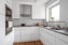Köket är modernt och praktiskt utfört i vinkel med mycket skåp och förvaring. Utförandet är stilrent med vita fronter och vitt kakel ovan arbetsytan av laminat. Den maskinella utrustningen består av häll, fläkt, ugn och micro i arbetshöjd, integrerad diskmaskin samt kombinerad kyl och frys. En matgrupp ryms intill fönstret med härlig utsikt över omgivningen.