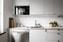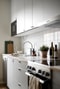 Köket är stilfullt och modernt utformat med gott om förvaring bakom skåpsluckorna. Köket erbjuder generösa arbetsytor på den ljusa bänkskivan. Ovanför bänkskivan sitter vitt kakel. Den maskinella utrustningen består av varmluftsugn med ovan spishäll, inbyggd mikro, fläkt, diskmaskin samt kombinerad kyl och frys. Plats finns för matbord.