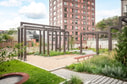 Gemensam grönskande gård med bänkar, lekplats, pergola och grillplats mellan husen.