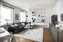 Köket har öppen del mot vardagsrummet och med stort fönsterparti mot balkongen. Skåp och lådor med vita luckor av spegelmodell. Massiv träbänk med dubbel diskho och ovan bänken sitter mörkt kakel. Köket har induktionshäll, varmluftsugn och micro som är inbyggda. Separat kyl och frys i rostfritt. Det finns även diskmaskin. Köket är rymligt och här finns en stor köksö som både har förvaring och fungerar som matplats.