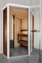 Det största badrummet ligger bara ett steg från master bedroom. Det är stort med moderna färger på kakel och klinker. Här finns våningens tvättavdelning under generösa arbetsytor och med förvaring i väggfasta skåp. Tvättmaskinen byttes ut 2026. Utöver wc, handfatskommod och dusch bakom klarglasväggar finns en hörnbastu med glasdörrar och dämpad belysning.