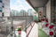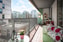Stor inglasad balkong med vy ner mot vattnet och poolområdet.