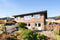 Två stenlagda uteplatser, en på husets framsida och en som vetter mot trädgården.
