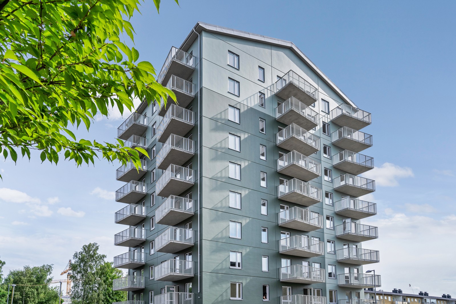 Modern trea med generös balkong i västerläge.