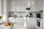 Köksdelen erbjuder ett kvalitativt kök från med Marbodal med skåpsinredning och luckor som går i vitt och bryts av mot bänkskiva i grått. Här finns allt man kan önska i maskinell utrustning och består av kombinerad kyl/frys, diskmaskin, induktionshäll, ugn samt inbyggd mikro.