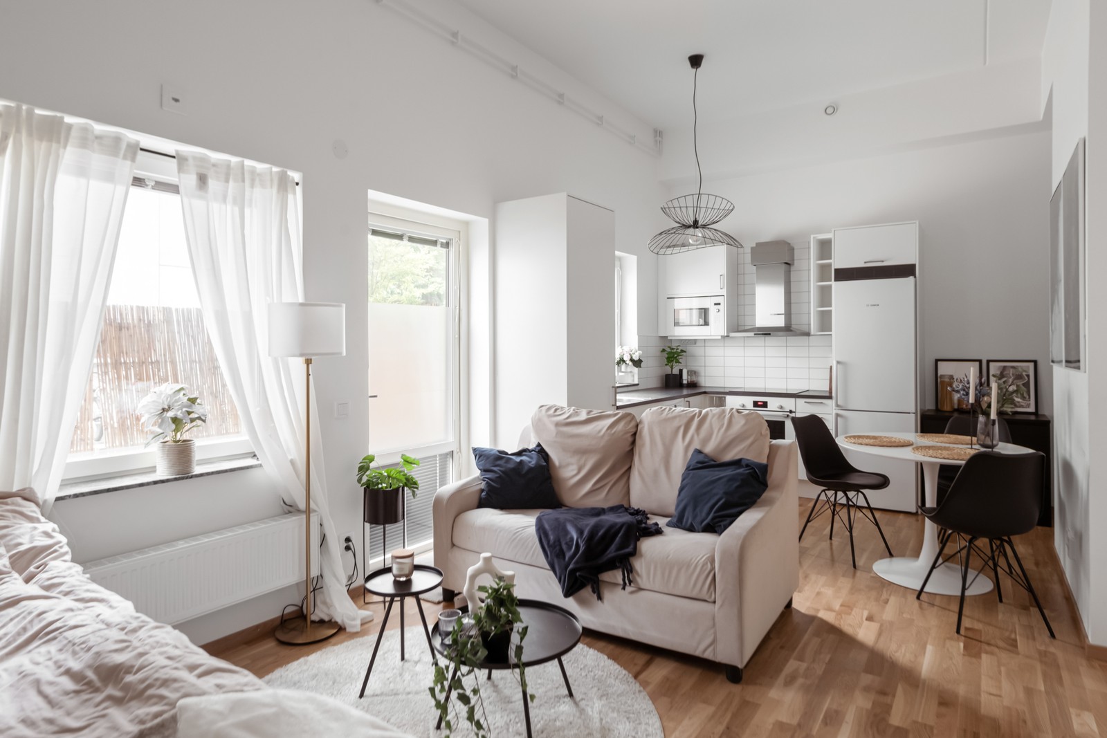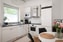 Köksinredningen går i vitt med ljust stänkskydd ovan. Modernt och ombonat. Bra förvaring i både över- och underskåp samt lådsektioner. Kombinerad kyl och frys i vitt utförande.