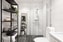 Bostadens badrum nås till höger från allrummet. Stort badrum som är inrett med duschhörna bakom två duschdörrar av klarglas. Vita liggande plattor på väggarna och kvadratiska, gråmelerade plattor på golvet. Stilrent och tidlöst. Tvättvårdsavdelning via tvätt och torkmaskin med vägghängt skåp och praktisk arbetsbänk. Utfällbar handdukshängare, handfat med kommod av två lådor och spegelskåp med belysning. Allt för en bekväm vardag.