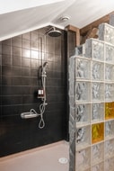 Badrummet är stort och rymligt med ett vädringsfönster som släpper in naturligt ljus och en stor duschhörna. Inredningen inkluderar wc, handfat med kommod, nyinstallerad tvättmaskin från Samsung, spegel samt ett högskåp som erbjuder generös förvaring. Väggarna pryds av mörkt kakel, och golvet är klätt med en slitstark plastmatta.