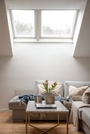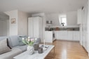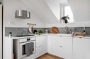 Till vänster om hallen finner ni köket som möter allrummet i en öppen planlösning. Köket är av generös storlek och bjuder både på bra arbetsyta samt gott om förvaring bakom de vita skåpluckorna. Den maskinella utrustningen består av kyl med frys, spis med fläkt samt diskmaskin för extra komfort. Två takfönster skänker ljusinsläpp till köket och skapar en trivsam plats för den matintresserade. I anslutning till vardagsrummet ryms ett matbord för 6-8 sittande gäster.