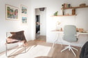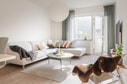 Ett ljust och rymligt vardagsrum som bjuder in till umgänge och avkoppling. Här finns gott om plats för både en större soffgrupp och en matgrupp. Det stora fönstret släpper in rikligt med naturligt ljus och skapar en härlig rymd i rummet. Från vardagsrummet nås en mysig balkong med utsikt över ett lugnt och grönskande område, perfekt för morgonkaffet eller en avkopplande stund i eftermiddagssolen. Vita väggar och högt i tak förstärker den luftiga känslan, och den ljusa enstavslaminat bidrar till en stilren och modern atmosfär.