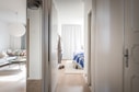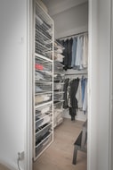 En välkomnande hall som ger ett inbjudande första intryck och öppnar upp sig mot vardagsrummet. Här finns praktisk förvaring bakom originalskåpen, samt en naturlig plats till vänster för skor, jackor och en hatthylla. Väggarna är målade i vitt, vilket gör att hallen känns ljus och luftig. Den enhetliga ljusa golvet binder samman hallen med övriga rum på ett smakfullt sätt.
