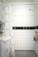 Ett stilrent badrum med grå plastmatta och vita kaklade väggar som bryts av med en elegant svart board. Här finns ett vägghängt spegelskåp för praktisk förvaring, ett handfat med kommod som erbjuder extra utrymme för hygienartiklar samt en wc och en dusch.