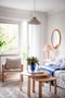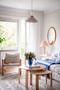 Ett luftigt och inbjudande vardagsrum med gott om plats för såväl soffa, matbord som tv-möbel. De ljusblå väggarna samspelar fint med det vita taket och parkettgolvet. Rummet är flexibelt och ger utrymme att inreda efter behov och stil. Härifrån nås även uteplatsen, vilket gör vardagsrummet till bostadens hjärta för både umgänge och avkoppling.