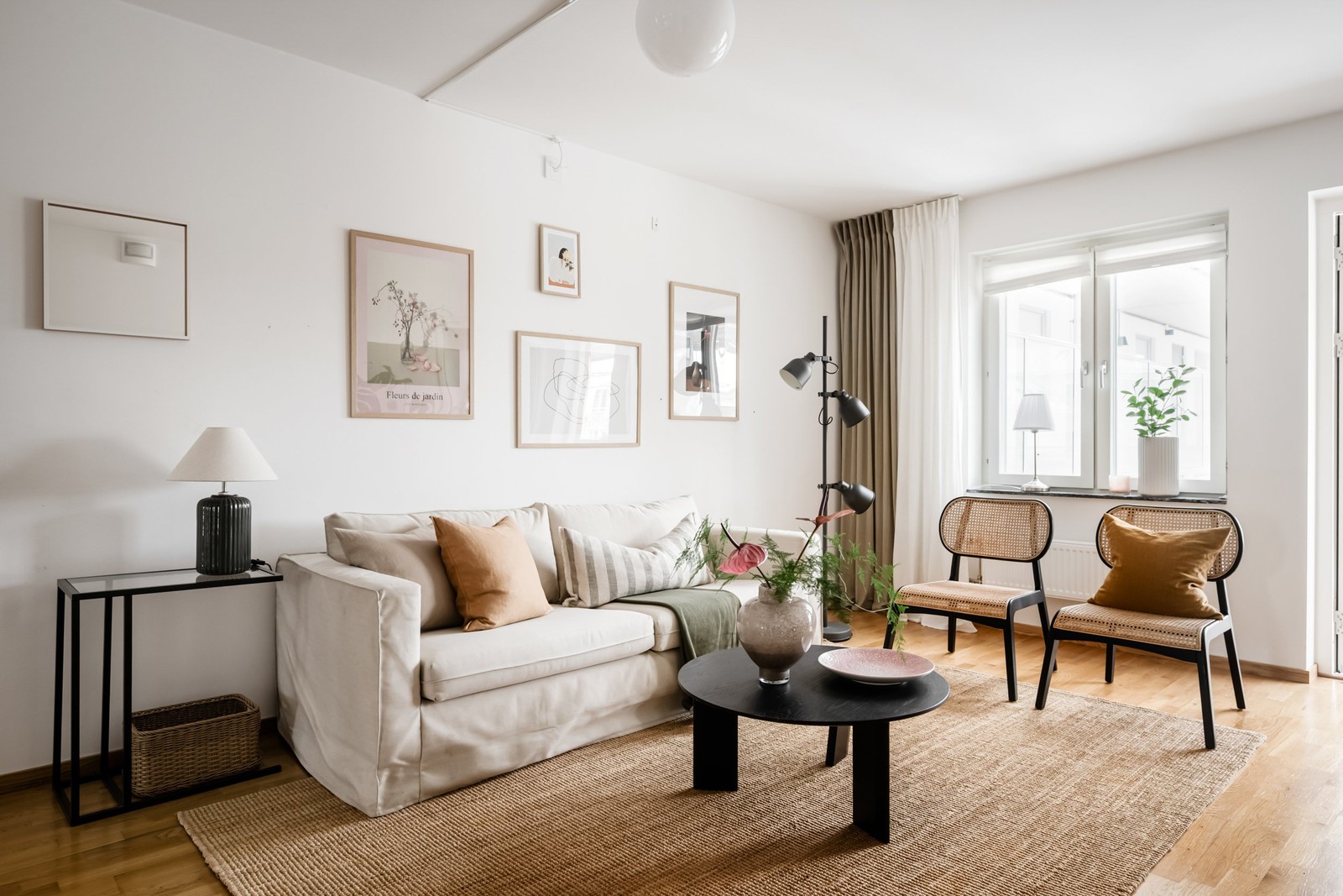 Vardagsrummet badar i ljus tack vare de generösa fönsterpartierna som vetter mot den lugna och grönskande innergården. Här erbjuds en inbjudande yta med flera möjligheter till möblering, plats för en större soffgrupp, läshörna eller middagsbord för sociala kvällar. Härifrån nås även bostadens balkong, där man gärna låter dörren stå på glänt under sommarhalvåret.