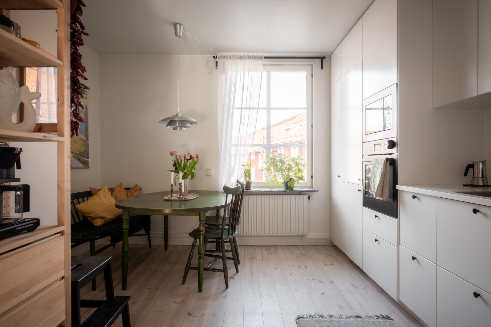 Det renoverade köket är ett riktigt trivsamt rum med gott om både arbetsyta och förvaring. Med grönskan utan för fönstret och dess ljusa skåpsluckor skapar en luftig och inbjudande känsla. Skåpsluckorna möter ett stilrent stänkskydd i samma nyans, både praktisk och estetiskt tilltalande. Den ljusa bänkskivan smälter bra ihop med resterande nyanser i köket, och framför det stora fönstret finns en naturlig plats för matbordet. Här får flera middagsgäster plats utan att det känns trångt, och ljuset som flödar in förstärker rummets luftiga känsla. Maskinellt är köket utrustat med kyl/frys, ugn, spis och fläkt samt mikro integrerat.