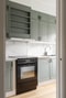 Det stilrena köket går i en vacker grön ton som harmoniserar med den vit- och gråspräckliga bänkskivan och de mörka vitvarorna. Här finns gott om arbetsyta och förvaring, samt plats för ett mindre matbord.