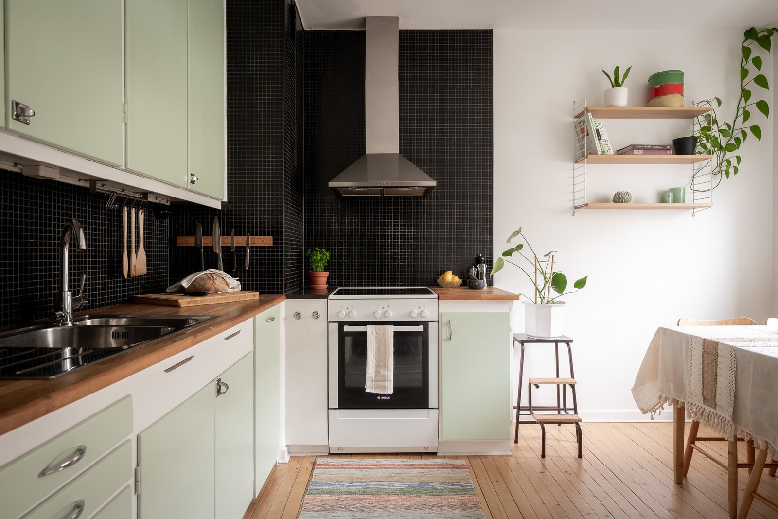 Ett kök med karaktär och bevarad originalcharm. De bevarade originalgolven och de mintgröna luckorna med vita stommar och träfärgad bänkskiva skapar en varm, hemtrevlig känsla. Små svarta klinkerplattor med vit fog ramar in rummet på ett elegant sätt. Här finns gott om arbetsyta, bra förvaring och plats för matbord. Utrustat med integrerad diskmaskin, ugn och fläkt, allt i en stil som smälter fint in i kökets tidstypiska estetik.