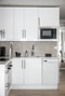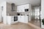 Vidare öppnar kök och vardagsrum upp i en social och luftig planlösning. Köket är stilrent utformat med vita köksluckor och rostfria beslag, tillsammans med en ljus stenskiva som tillför både elegans och funktion. Ovan arbetsytorna sitter stora, ljusgrå kakelplattor som ger ett harmoniskt och modernt uttryck. Den maskinella utrustningen består av kombinerad kyl/frys, häll, ugn, mikro, kolfilterfläkt samt diskmaskin. Här finns gott om plats för ett större matbord i direkt anslutning till vardagsrummet.