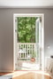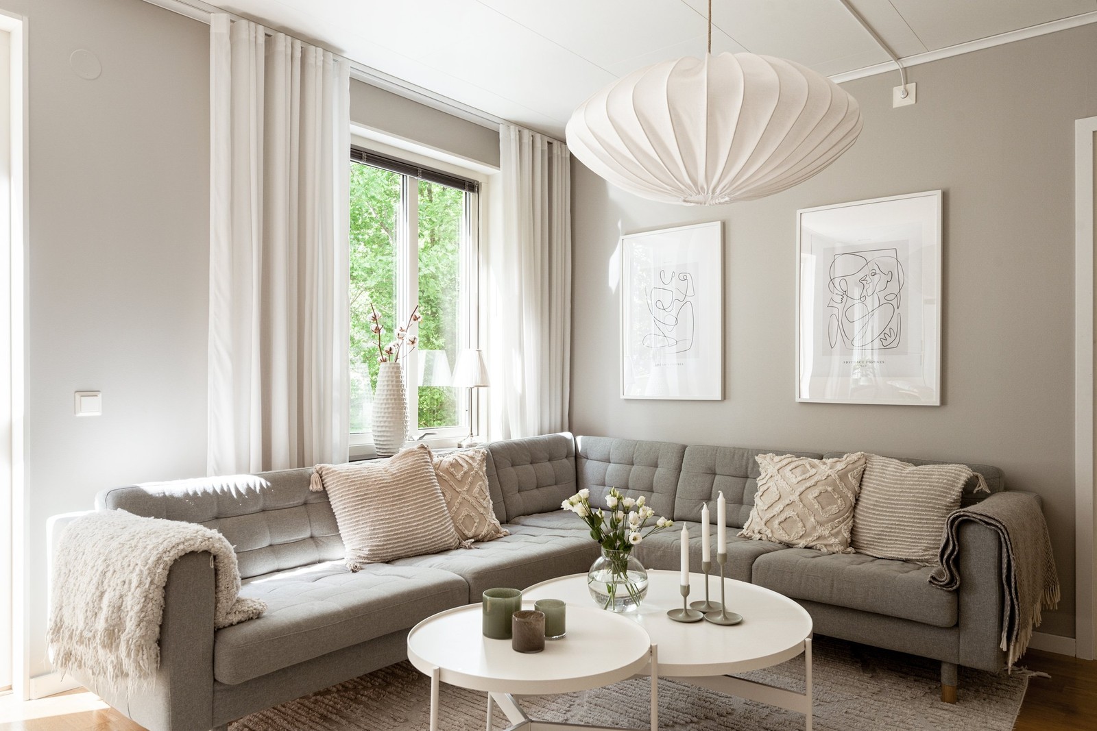 Från hallen förs ni vidare in i bostadens vardagsrum. Här strömmar ljuset fritt från stora fönsterpartier vilket bidrar till rummets luftiga och harmoniska känsla. Här kan man med enkelhet möblera med en soffa, soffbord och tv-möbel. Det är även från vardagsrummet som ni når bostadens härliga balkong som vetter mot grönska och erbjuder härlig eftermiddagssol.