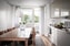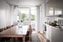 Köket, med inredning från 2017, går i grå ton och har en bänkskiva i rostfritt stål med vitt stänkskydd ovanför. Den maskinella utrustningen består av spis med varmluftsugn, fläkt, diskmaskin, mikrovågsugn samt kyl och frys. Förvaringsmöjligheterna är generösa med både vägg-, bänk- och högskåp. Intill det stora fönsterpartiet får en matgrupp för ca 6 personer plats. Härifrån nås den soliga balkongen.