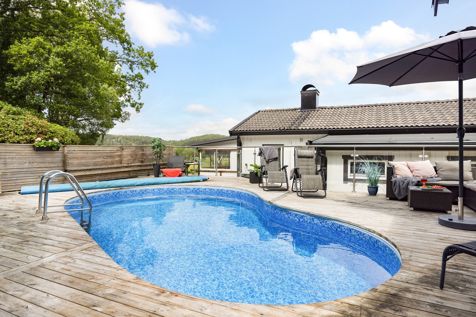 Utvändigt väntar en fin miljö med både gräsmatta och altaner. På den övre altanen kan ni njuta av sköna dopp i poolen och härligt solbadande under sommaren. Intill poolen finns Attefallshuset med sovrum, pentry(utan vatten) samt badrum med frystoa och sommarvatten.