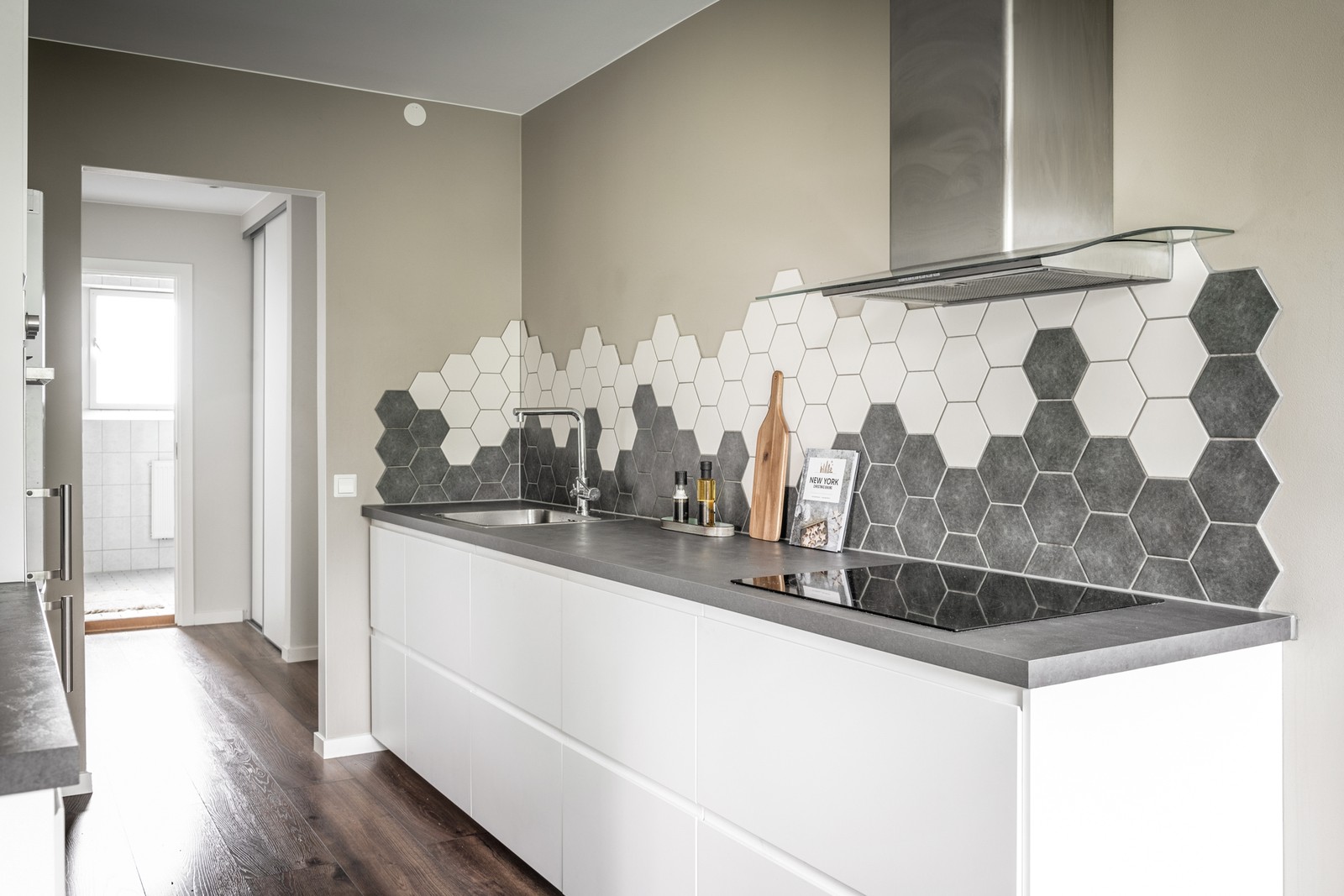 Nyrenoverat och stilrent kök hittar ni till vänster om entrén. Inbjudande matplats intill fönstret med plats för 4-6 personer. Vita köksluckor pryder köket elegant tillsammans med vitvarorna. Den maskinella utrustningen består av induktionshäll, köksfläkt, inbyggd ugn i behaglig arbetshöjd, integrerad diskmaskin samt kyl/frys. Ett elegant kök att trivas i.