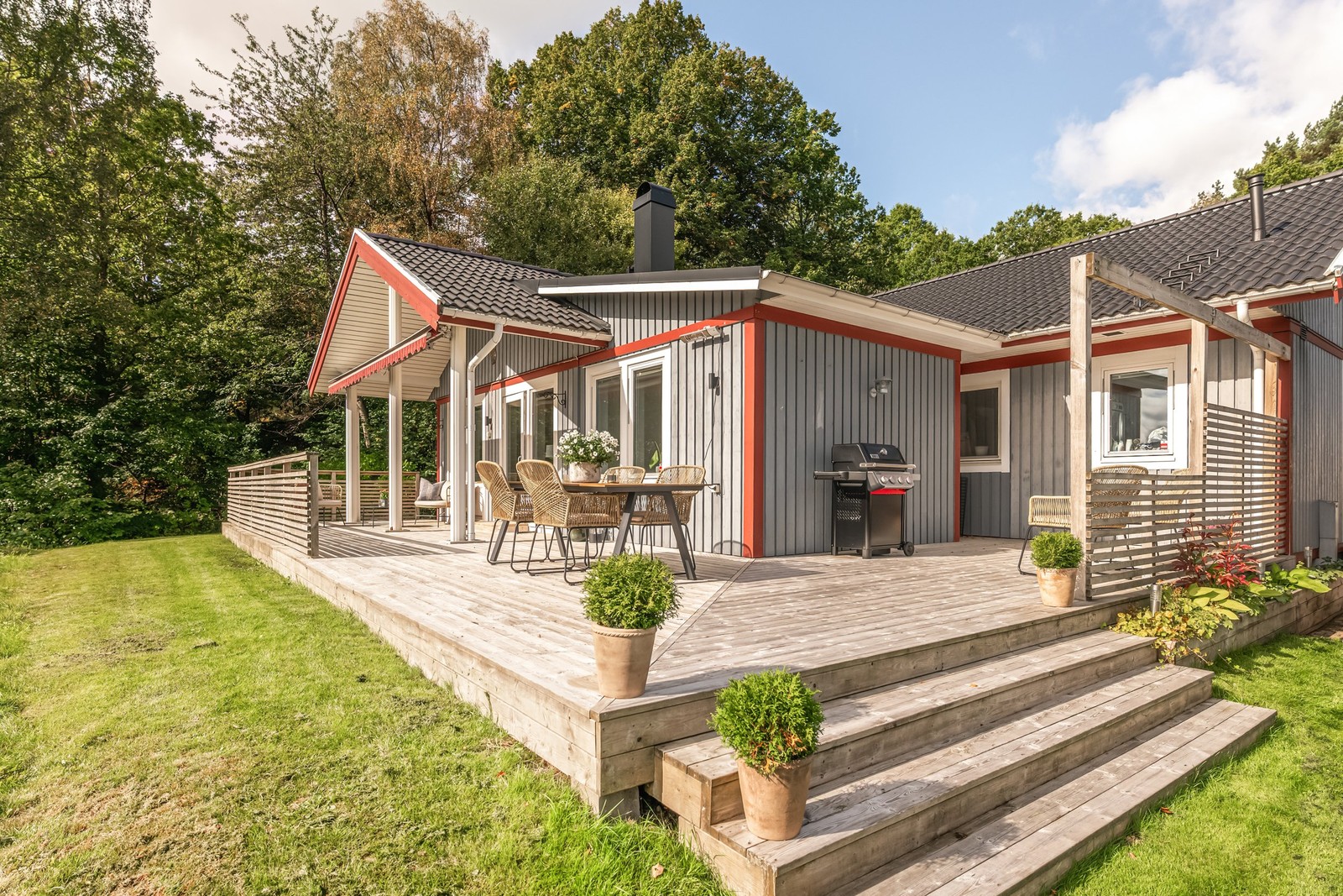 Stilfull enplansvilla med ljusa ytor, braskamin och barnvänligt läge