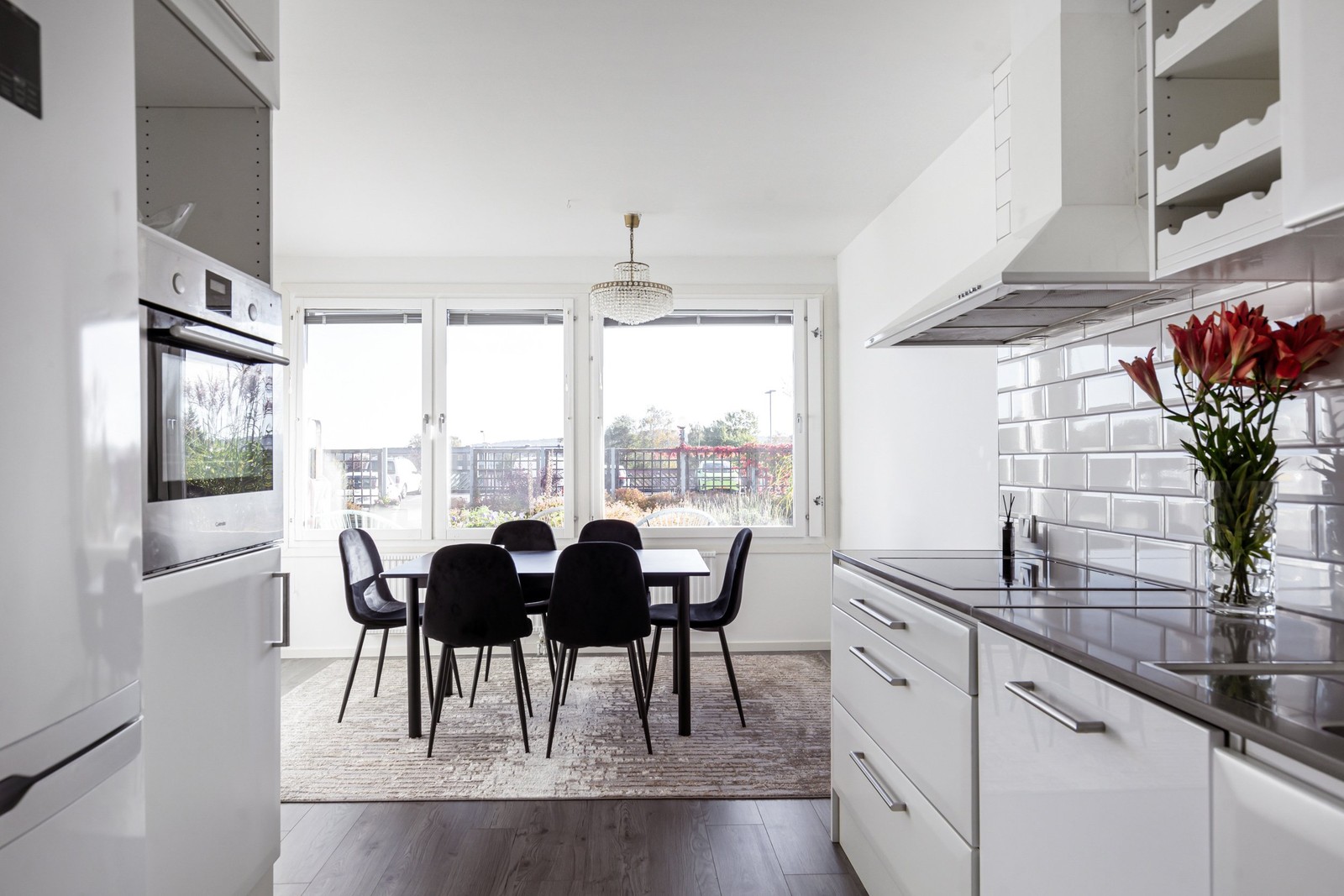 Till vänster om entrén ligger det stilrena köket som är renoverat 2023. Ett funktionellt kök med god förvaring och gott om arbetsyta. Den maskinella utrustningen består av spis, fläkt, dubbelho samt kombinerad kyl/frys. Framför de fantastiska fönsterpartierna finns plats för stor matplats.