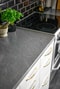 Till höger om entrén ligger lägenhetens kök. På golvet ligger ett mörkt golv och väggarna är vita. Köket har ljusa skåpsluckor, arbetsbänk och ovan bänken sitter snyggt kakel i svart. Här finns gott skåp med plats för förvaring. Den maskinella utrustningen består av en kombinerad kyl och frys, ugn och spis, spisfläkt samt diskmaskin. Här finns en naturlig matplats för flera invid fönsterpartiet.