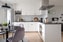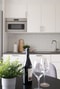 Till vänster om entrén ligger lägenhetens magiska kök. Köket har påkostade materialval i form av vita släta skåpluckor, vitt kakel som bryts av med en mörk bänkskiva. Den maskinella utrustningen består av en kombinerad kyl och frys,, ugn, spishäll, fläkt, mikro samt diskmaskin.