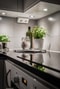 Köket från Ballingslöv är praktiskt och stilfullt med vita köksluckor som rymmer gott om förvaring. Ovan arbetsbänken i granit sitter ett ljusgrått kakel i liggande fattning. Köket är utrustat med induktionshäll, fläkt, ugn, inbyggd micro, samt kombinerad kyl/frys.