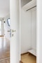 Inbjudande entréhall som möter ljuset ifrån vardagsrummet. Här finns en rymlig klädkammare samt gott om plats för ytterkläder och skor. På golvet ligger laminat och väggarna är målade i vitt.