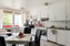 Rakt fram om hallen ligger det praktiska och stilfulla köket. Här finns rikligt med skåp och arbetsyta. Ovan arbetsbänken i grått sitter snyggt stänkskydd i vitt. Den maskinella utrustningen består av spis med ugn, spisfläkt, diskmaskin och fristående frys och kyl. Framför de fantastiska fönsterpartierna finns plats för stor matplats.