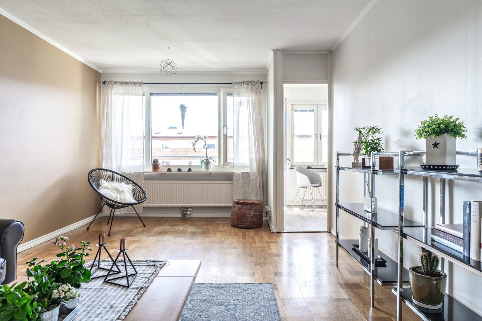 Vardagsrummet är rymligt och har plats för både soffgrupp och tillhörande möblemang. Ett stort fönsterparti ger ett härligt ljus i bostaden. Det ljusa och välplanerade köket har gott om arbetsytor och förvaring i skåp. Matplatsen invid fönstret har gott om plats för trevliga middagar. Perfekt lägenhet för familjen med närhet till all tänkbar service och med goda kommunikationer in till city. P-plats och bredband ingår i månadsavgiften.