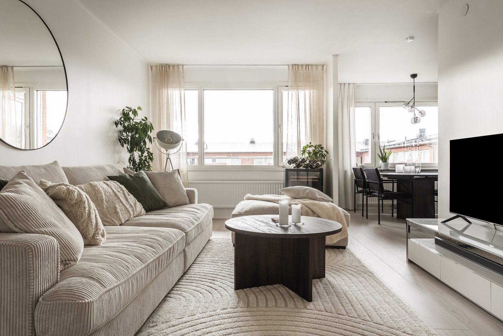 Vardagsrummet är ett stort, ljust och inbjudande rum där den öppna känslan förstärks av de generösa fönsterpartierna. Den ljusa färgsättningen tillsammans med det enhetliga golvet skapar en harmonisk bas som låter möblering och inredning ta plats. Här ryms utan problem en större soffgrupp, tv-möbel och övrigt möblemang för sociala sammanhang.