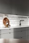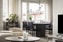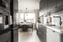 Köket är modernt, fullutrustat och smakfullt renoverat i tidlösa färger. De mörka släta skåpsluckorna matchas elegant med den ljusa bänkskivan i stenlook och vitt fasat kakel. Här finns gott om arbetsyta, smart förvaring och en komplett maskinpark med bland annat integrerad ugn, mikrovågsugn, induktionshäll och diskmaskin.