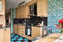 Ett snyggt och tidlöst kök där golvet pryds av klassiska mönster i svart och blått. Arbetsbänken är i mörkt laminat som bryter snyggt av mot träluckorna. Köket erbjuder gott om förvaringsmöjligheter och arbetsyta. Den maskinella utrustningen består av en induktionshäll, integrerad diskmaskin, micro, fläkt, varmluftsugn samt kyl- och frys i fullhöjd. Invid fönstret finns en naturlig matplats i direkt anslutning till balkongen där man ledigt sitter 4-6 personer. Här finns en öppning mot vardagsrummet.