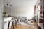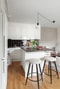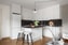 Till höger finner ni köket som är praktiskt och stilfullt med vita köksluckor som rymmer gott om förvaring. Ovan arbetsbänken sitter ett svart kakel. Köket är utrustat med spis, fläkt, ugn, kombinerad kyl och frys samt en diskmaskin. Här finns även en praktisk och stilren köksö, perfekt när man vill vara flera i köket. Vardagsrumsdelen är rymlig med gott om plats för en större soffgrupp med tillhörande möblemang.