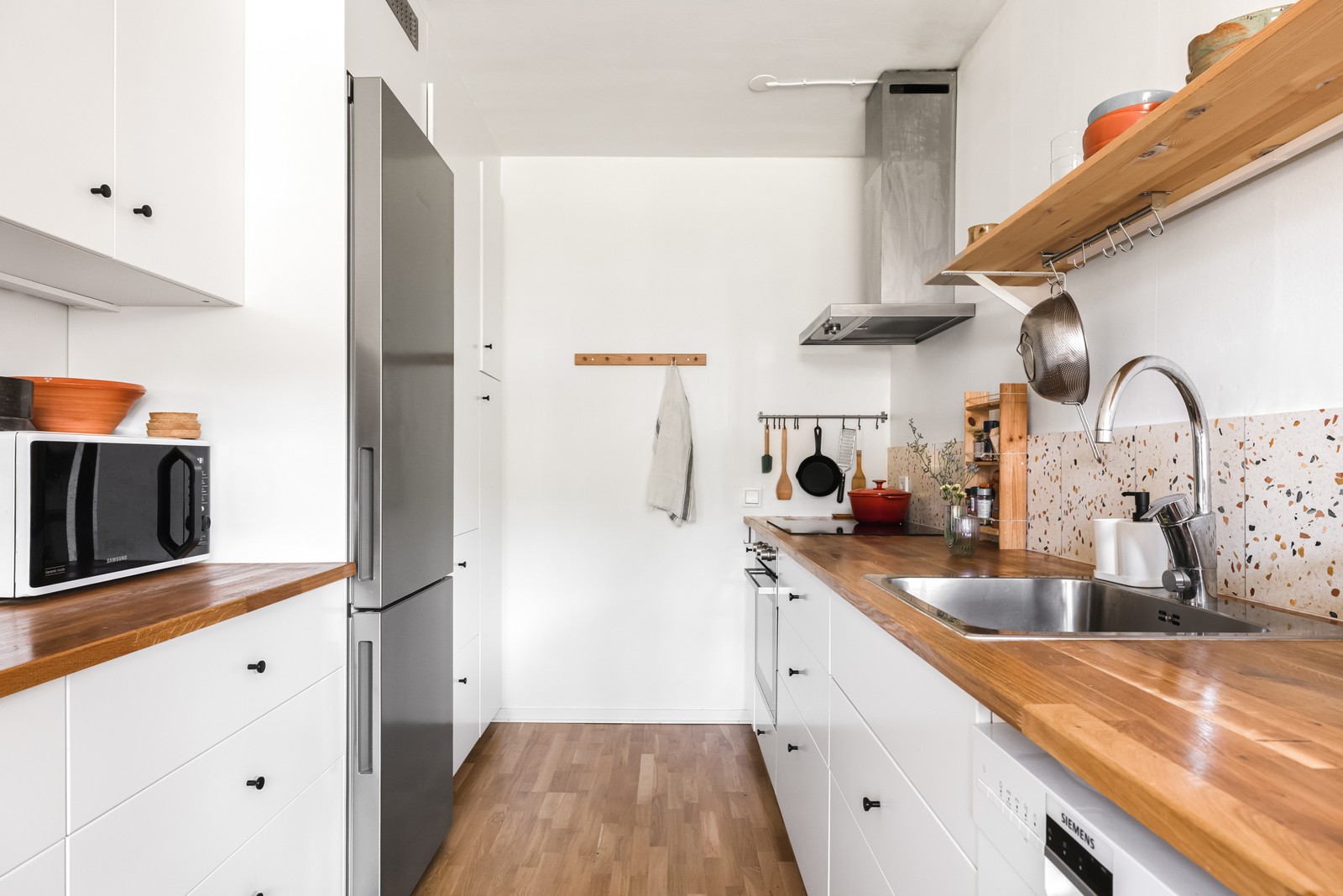 Det renoverade och eleganta köket kombineras i vitt och trä. Genomtänkt köksplanering med en bra fördelning av lådor, skåp samt arbetsyta. Här finns matplats för 4-6 personer invid fönster som erbjuder trevlig utsikt och ljusinsläpp. Den maskinella utrustningen består av spishäll, diskmaskin, fläkt och kombinerad kyl/frys.