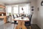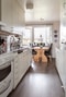 Praktiskt kök i ljusa toner som erbjuder gott om förvaringsmöjligheter i både över- och underskåp. Ovan bänkskivan sitter vitt kakel. Den maskinella utrustningen består av en spis, ugn, fläkt, kyl samt diskmaskin. Ett matbord och sex stycken stolar har sin givna placering invid det stora fönsterpartiet tillsammans med en utgång till framsidans uteplats.