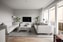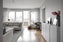 Modernt kök i ljusgrått som erbjuder gott om förvaringsmöjligheter i både över- och underskåp. Ovan den ljusa bankskivan sitter vitt kakel. Den maskinella utrustningen består av en spishäll, fläkt, inbyggd ugn och mikro i behaglig arbetshöjd, hel kyl och frys samt diskmaskin. Ett matbord och sex stycken stolar har sin givna placering invid det stora fönsterpartiet tillsammans med en utgång till framsidans uteplats.